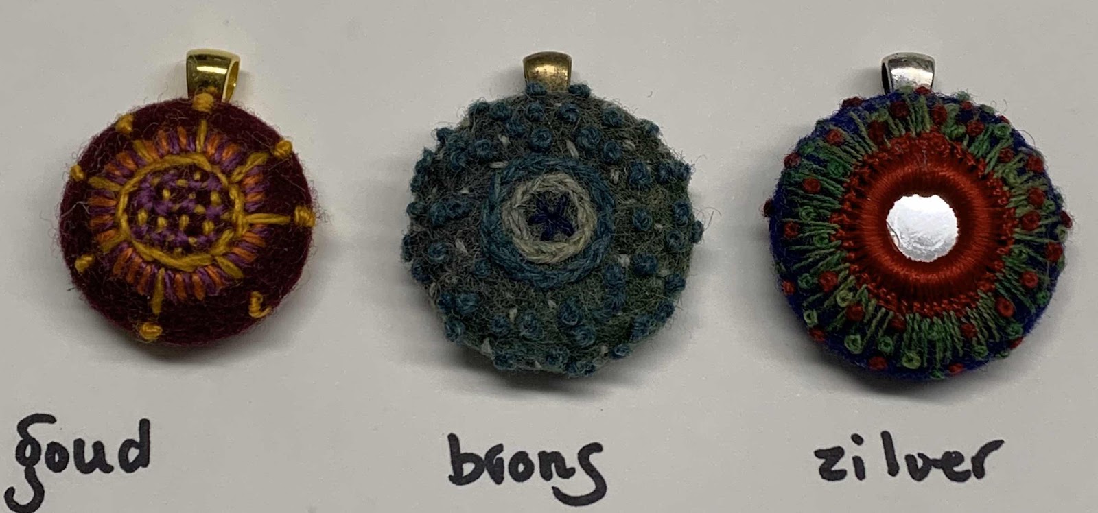 Inmiddels in goud, brons, zilver en zwart in metaal. En nu ook mooie houten gevonden, broche spelden en platte mat zilver.